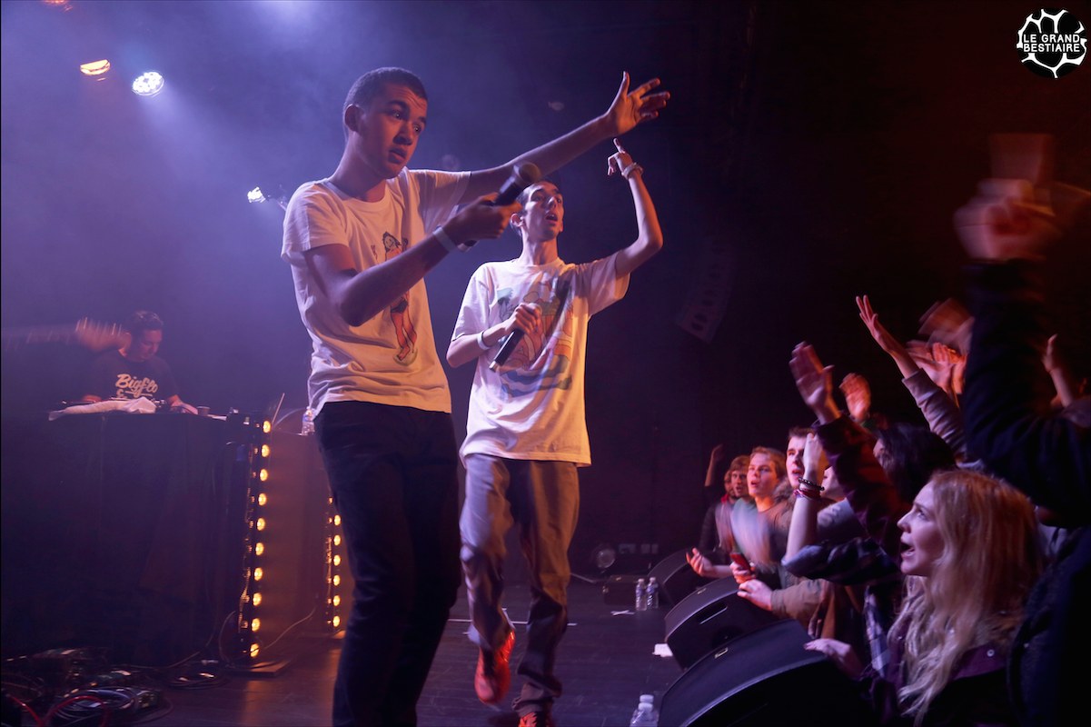 Arrivée sur place à 19h30 comme précisé sur le billet, la salle n’ouvrira ses portes qu’a 20h. Déjà une foule attend calmement en file, pas un bruit, étonnant pour un concert de Rap. Le public est composé de très jeunes -16-22ans – avec une forte prédominance du style vestimentaire reggae : saroual, dreadlocks et nombreux piercings faciaux. Comme tout concert “jeune” qui se respecte, l’autre partie de la foule est de style hipster, carhartt et vans, look des pieds à la tête. À 20h l’ouverture est lancée, le public est invité à pénétrer calmement à l’intérieur. Dans la salle lounge, les deux frérots Bigflo & Oli mangent une compote, pépères, sereins sur la performance qu’ils vont accomplir.