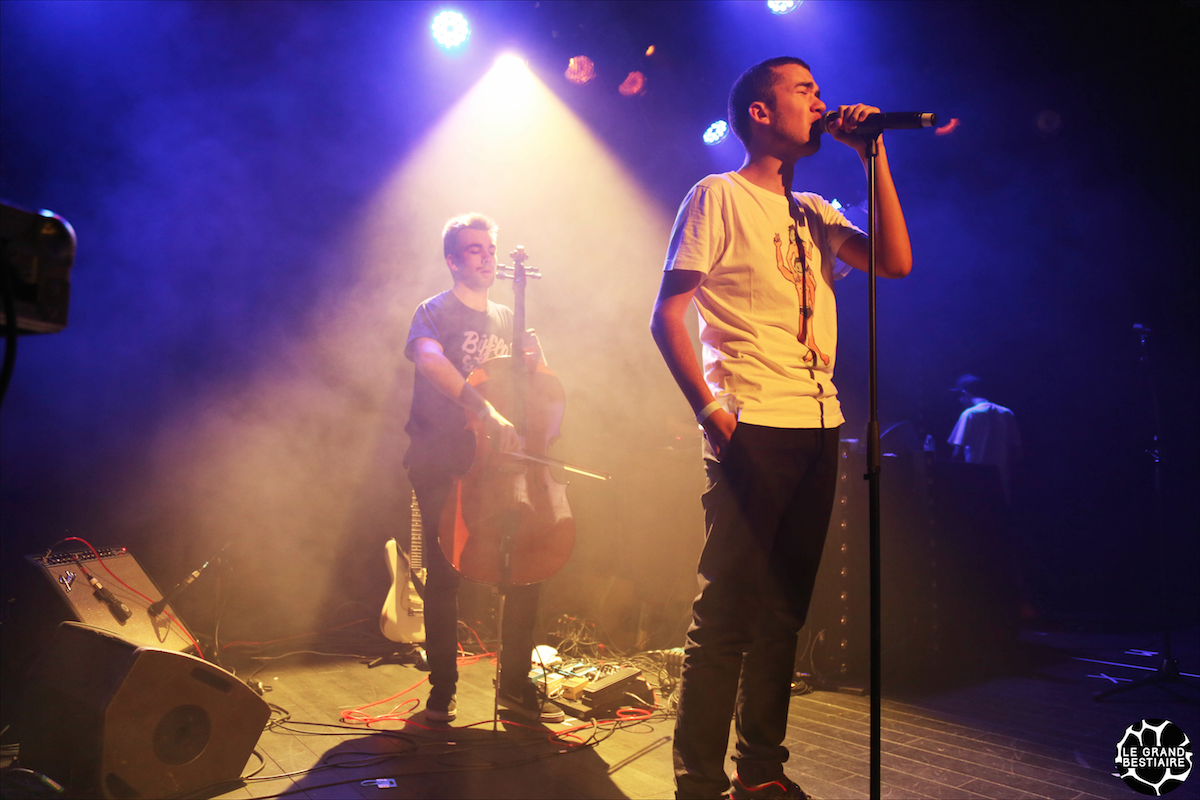 À peine 15 minutes après l’ouverture de la salle, juste le temps de poser ses affaires et de s’agglutiner devant la scène : première partie. C’est Le Bon Nob qui prend la scène, la trentaine, casquette à l’appui, il chauffe la salle avec brio. Ses textes sont pointus et son rap précis, des plosives explosives font vibrer la foule. Pour un quart d’heure de préchauffe c’est d’une efficacité renversante. En janvier son album P’tit Con sortira, à écouter sans doute. Le message est clair, bouger la tête, positive attitude et revanchardise. Il laisse la place a Bigflo & Oli. Le public est fin prêt, ils ont intérêt à assurer !