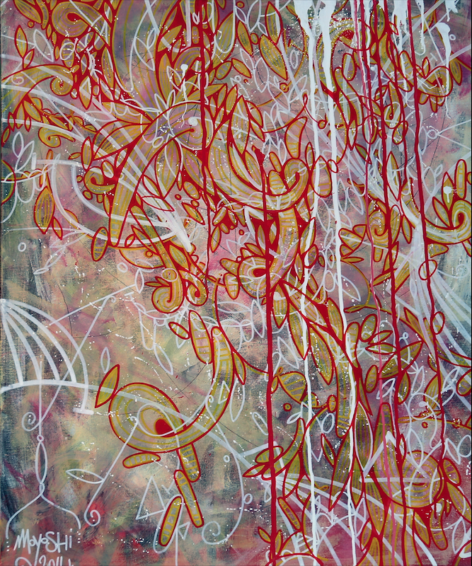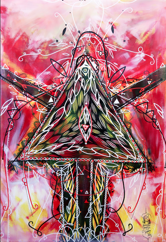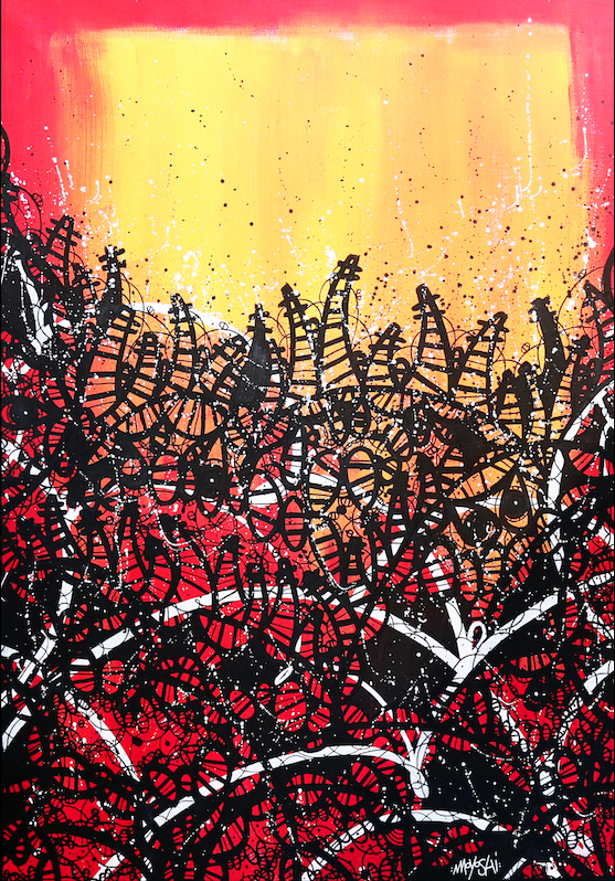 À grands coups de Posca ; traits, courbes et dynamique forment des œuvres hautes en couleurs dans un univers abstrait oscillant entre le végétal et l’animal. Ces coups de feutres effleurent les portraits et regards de Kym mêlant dessin et aquarelle. « Mes premiers dessins c’était des yeux de manga. Je suis passé au niveau au-dessus en trouvant ma patte pendant mes études », raconte-t-elle.