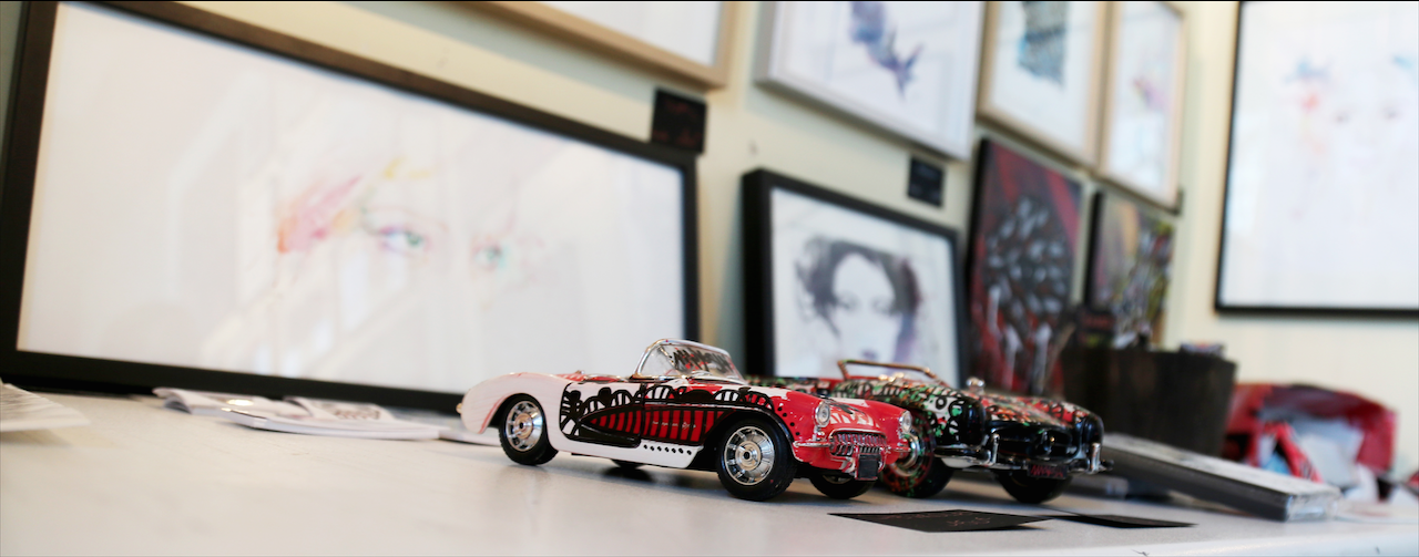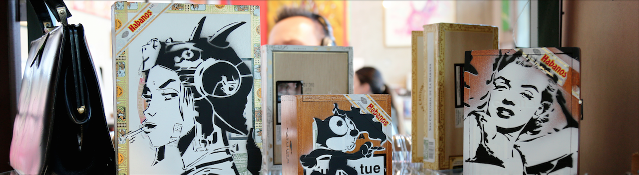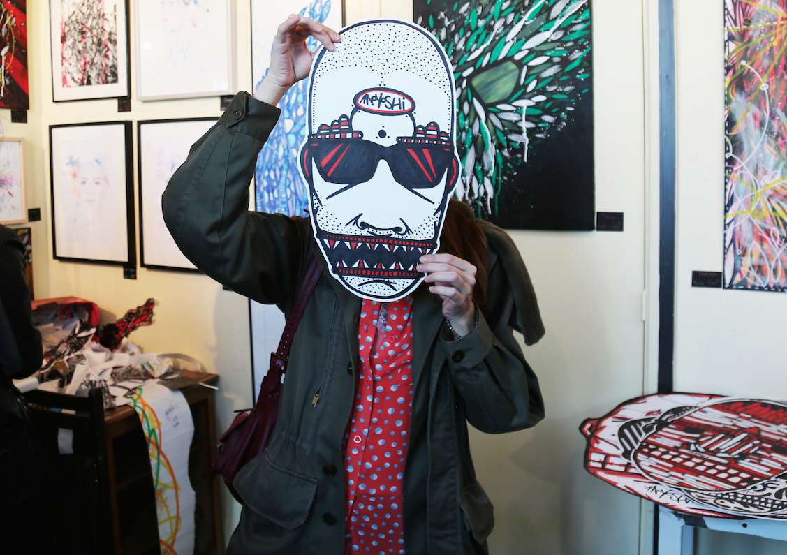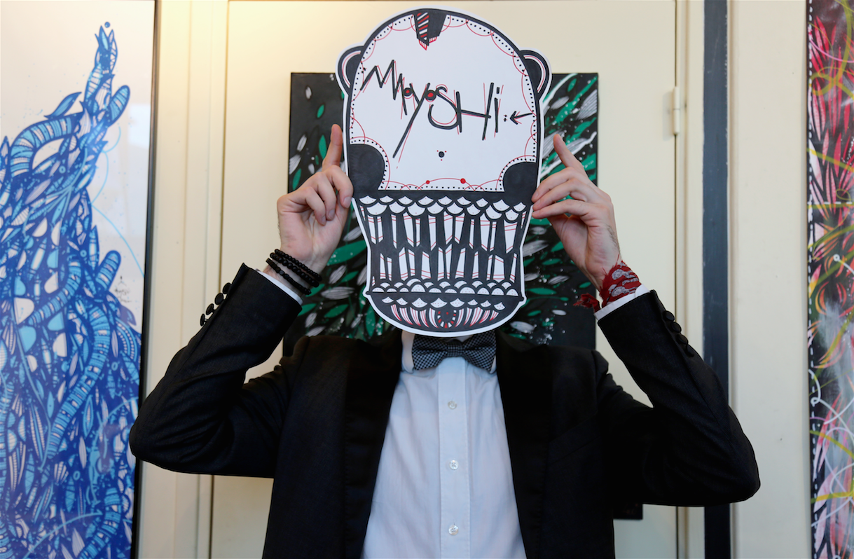 Entre deux bouffées de cigarette, Moyoshi raconte comment il en est venu à s’exposer au Lavo//Matik : « J’habite à quelques mètre d’ici, et j’avais vu la première exposition du Lavo // Matik, c’était des œuvres de Jef Aérosol. J’ai énormément apprécié l’univers et l’ambiance du lieu. Je n’expose pas trop habituellement, mais Ben (le patron) m’a proposé de faire une exposition. Moi, de mon coté j’ai proposé à Kym de participer à cet évènement en tant qu’artiste, pour la motiver et lui donner l’envie de se dépasser, et de présenter ses œuvres. Cette exposition permet également de nous officialiser en tant que couple dans la sphère publique. »